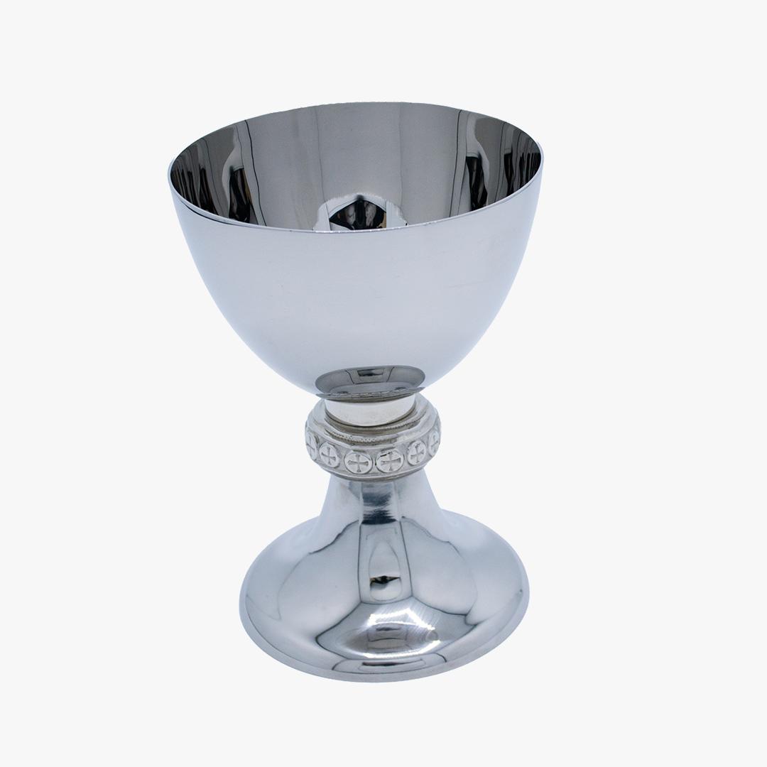 Cálice de aço inoxidável, prateado. Nó trabalho com símbolo do pão.