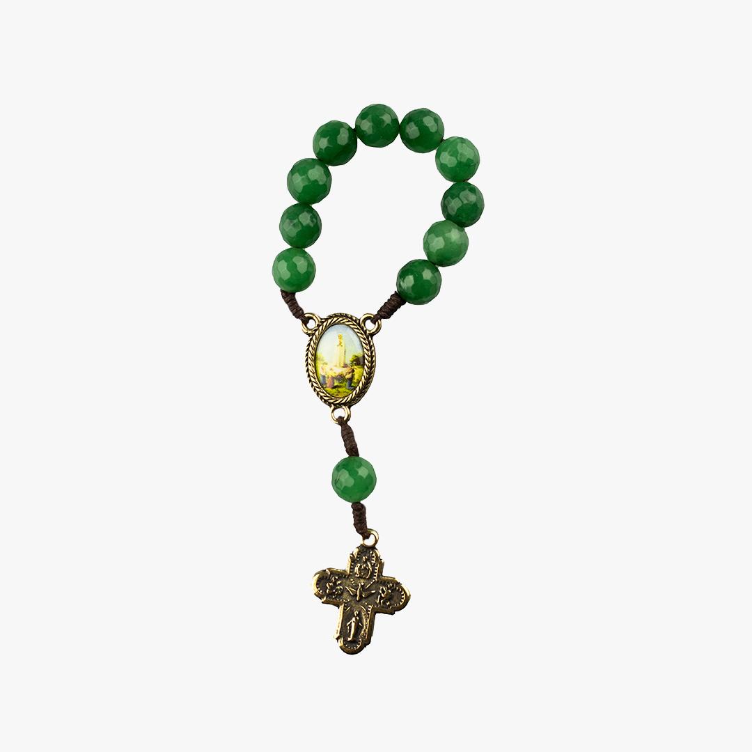 Dezena em pedra Agata verde. Medalha com a Aparição de N. S. de Fátima numa das faces e na outra face N. S. de Fátima.