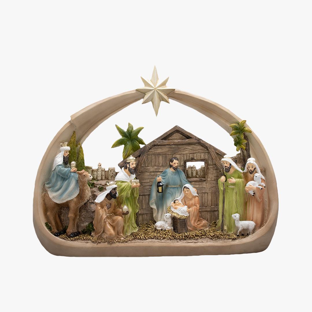 Imagem do Presépio envolto numa moldura que culmina em forma de estrela.