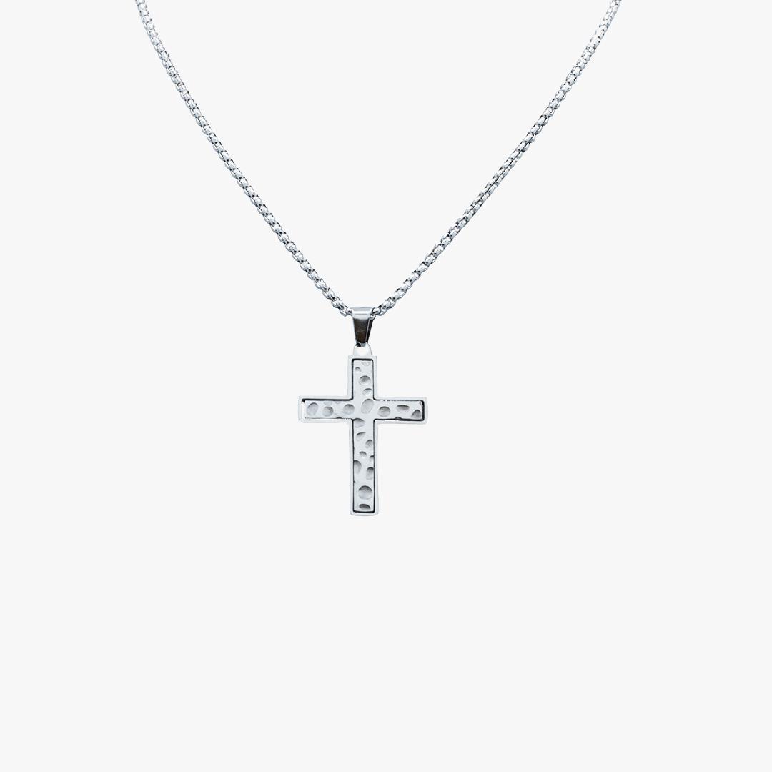 Fio em aço com cruz prateada, com pequenas saliências.