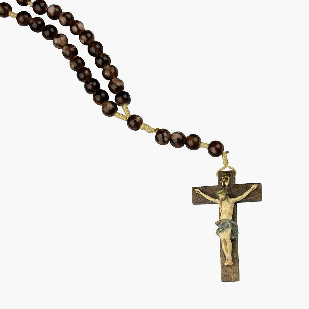 Terço em cordão e vidro marmorizado, com um crucifixo de madeira.