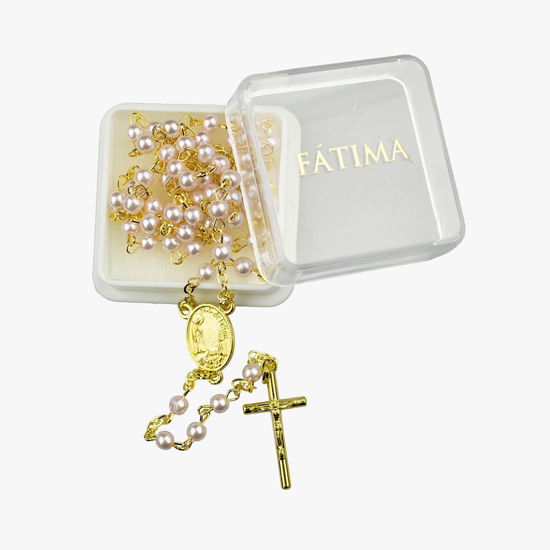 Terço de pérola com mosquetão, medalha com a representação da Aparição de N. S. de Fátima aos Pastorinhos. Caixa de plástico transparente, incluída.