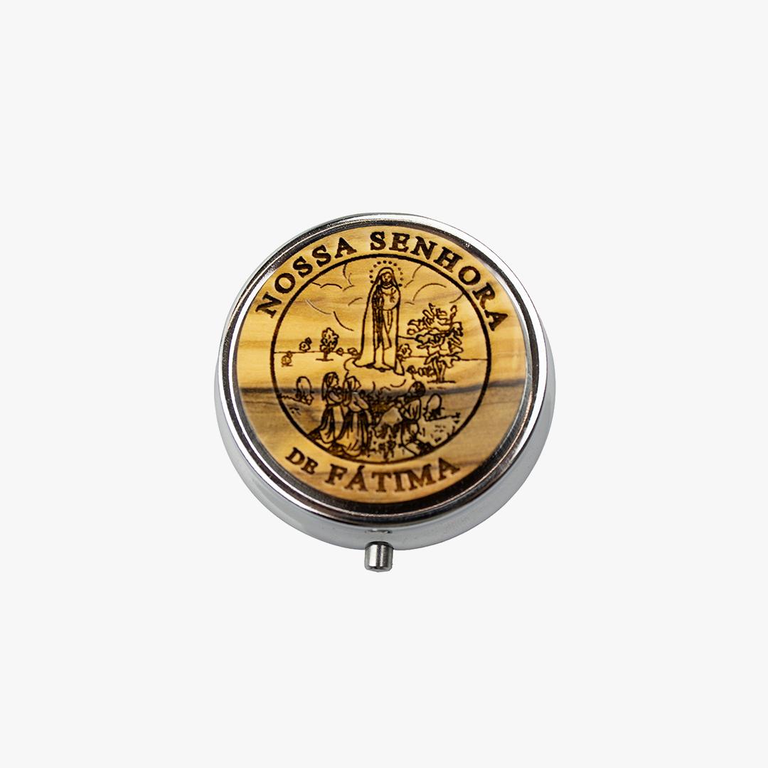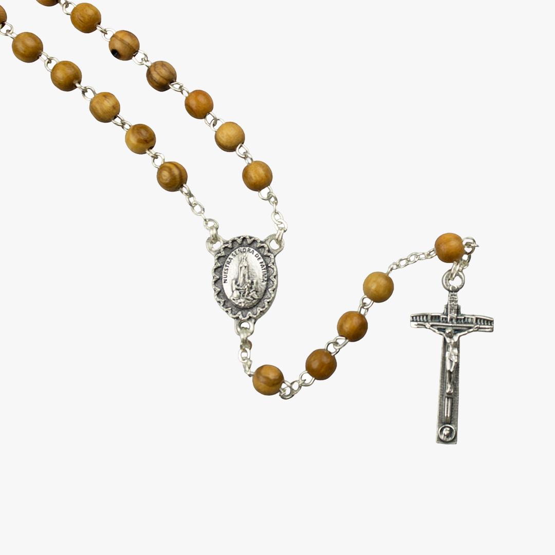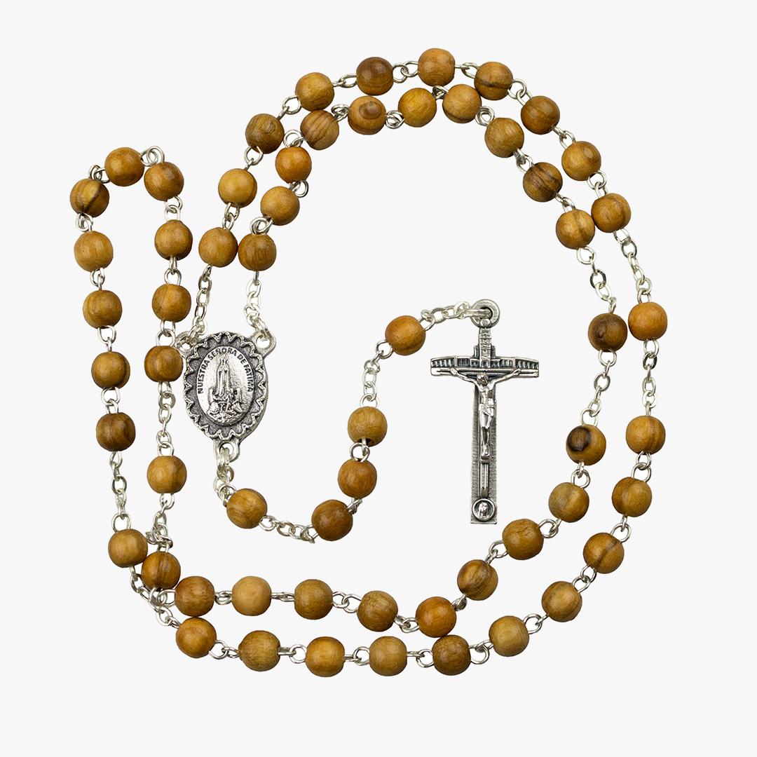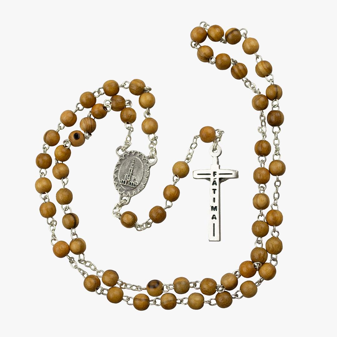 Terço com contas em madeira. A medalha que une as partes tem a representação da Aparição de Nossa Senhora de Fátima aos Pastorinhos numa das faces e na outra face a Basílica de N. S. do Rosário de Fátima. Caixa em metal prateado, com madiera por cima.