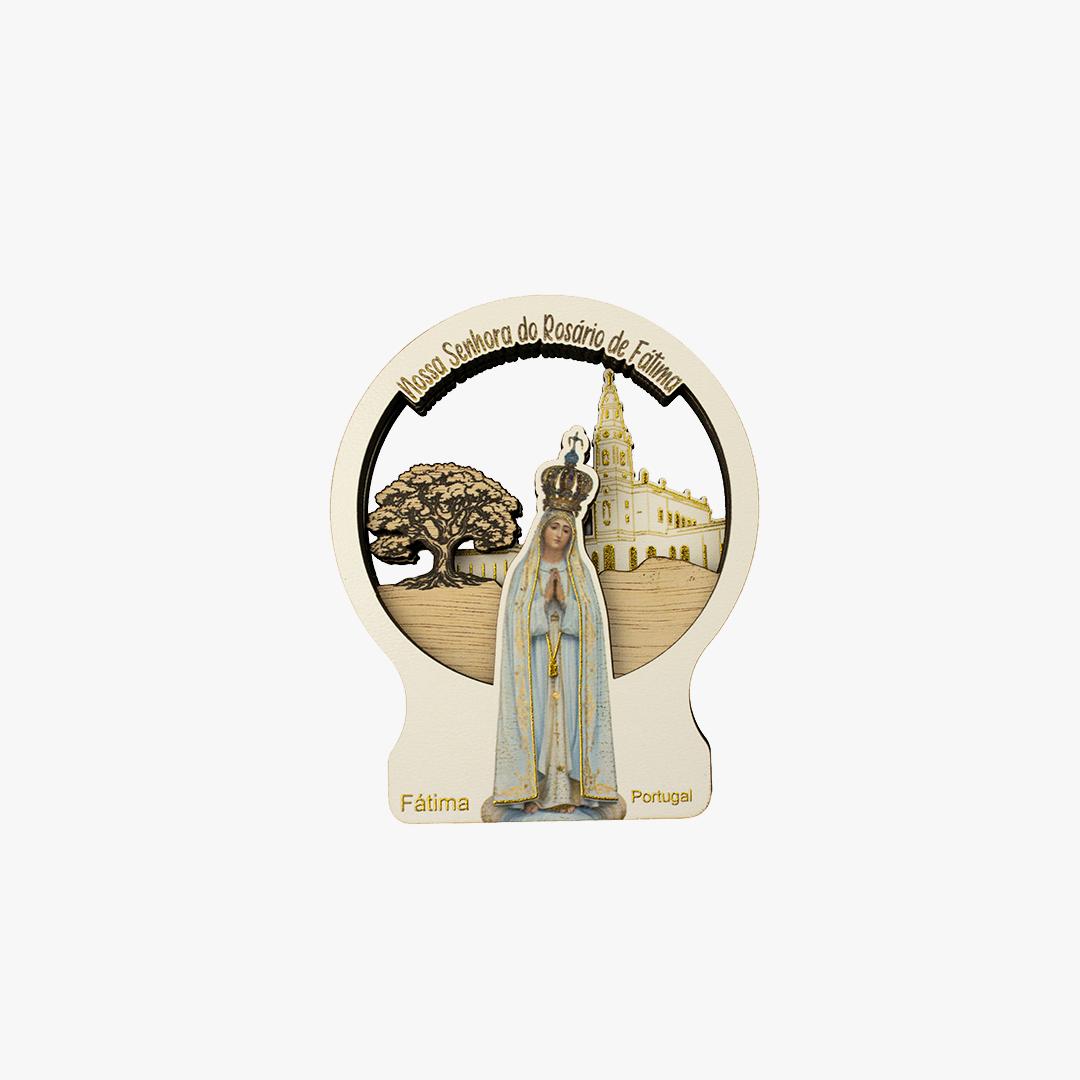 Íman em madeira, com a representação de N. S. de Fátima, em relevo, atrás uma oliveira e a Basílica de N. S. do Rosário de Fátima.
