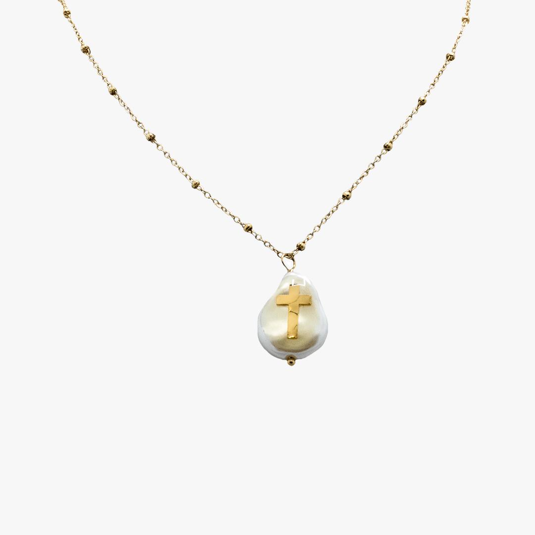 Fio de aço com uma pérola em que assenta uma cruz dourada.