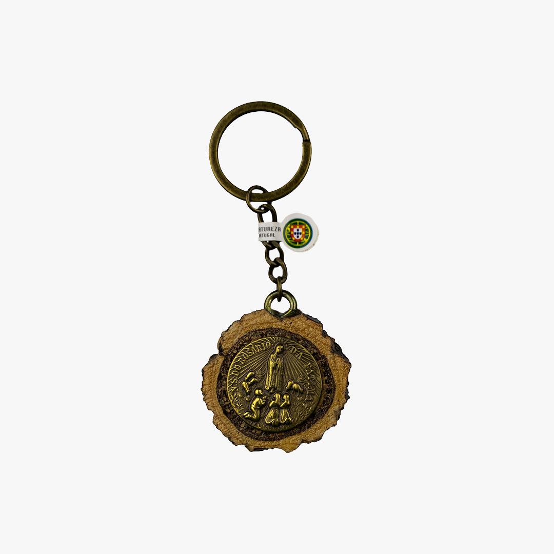 Porta-chaves em madeira de sobreiro com medalha representativa da Aparição de N. S. de Fátima aos Pastorinhos numa das faces e na outra a palavra: "Fátima".