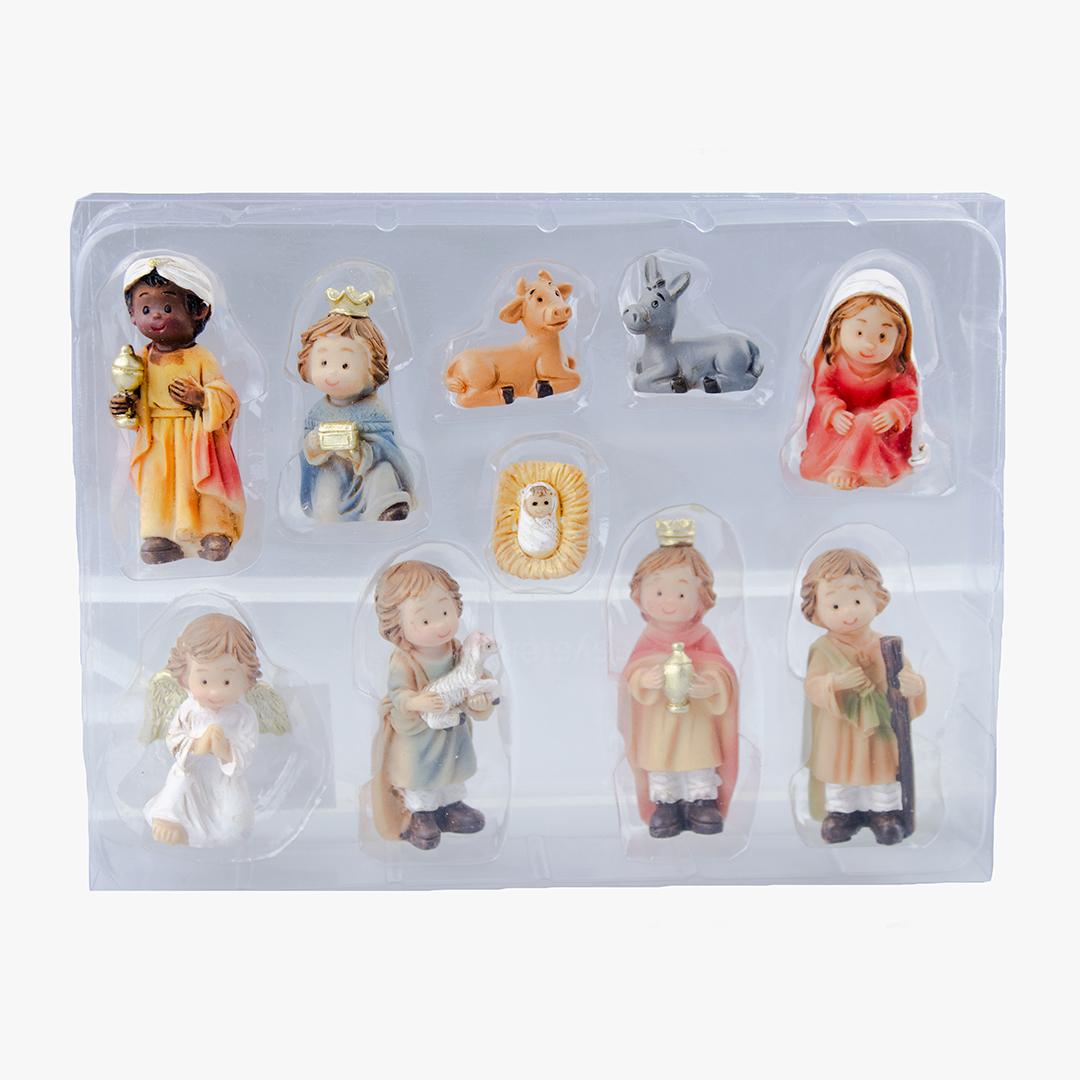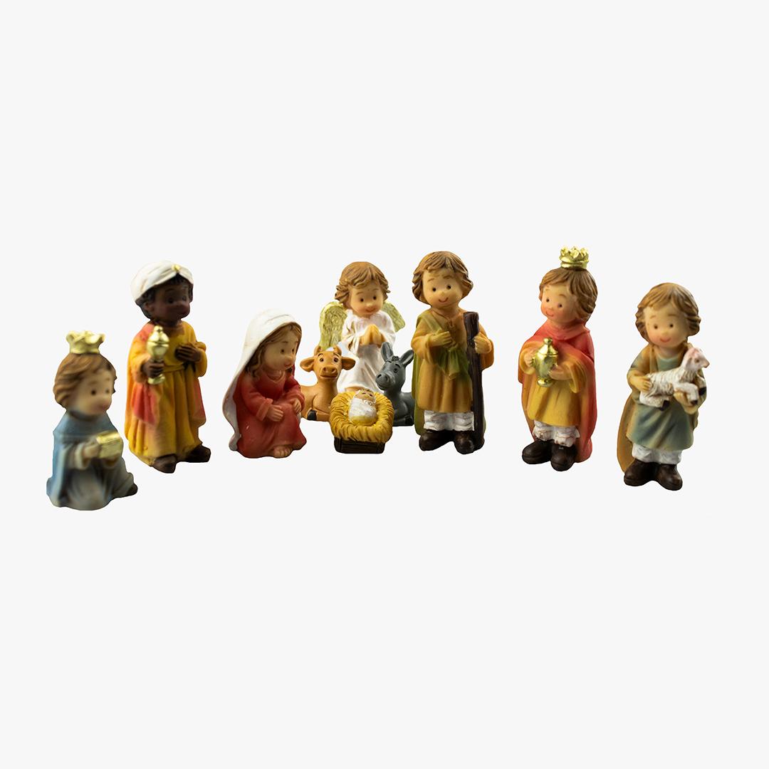 Presépio constituído por 10 figuras: Maria; José; Jesus; três Magos; pastor; anjo; vaca e burro.