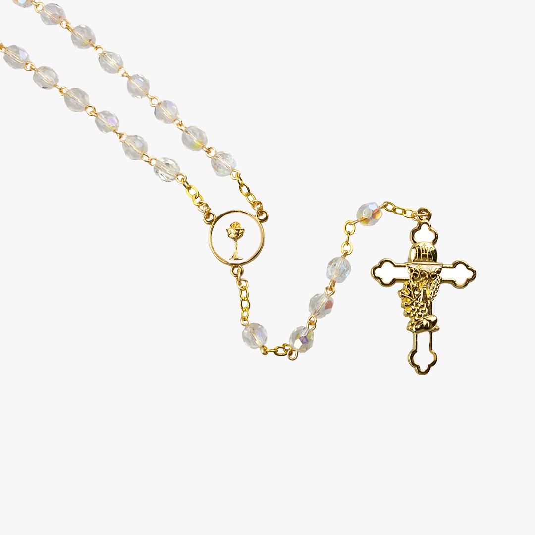 Terço com as contas em cristal transparente, medalha com o Cálice e cruz com os os símbolos da Comunhão. Caixa em plástico transparente, incluída.