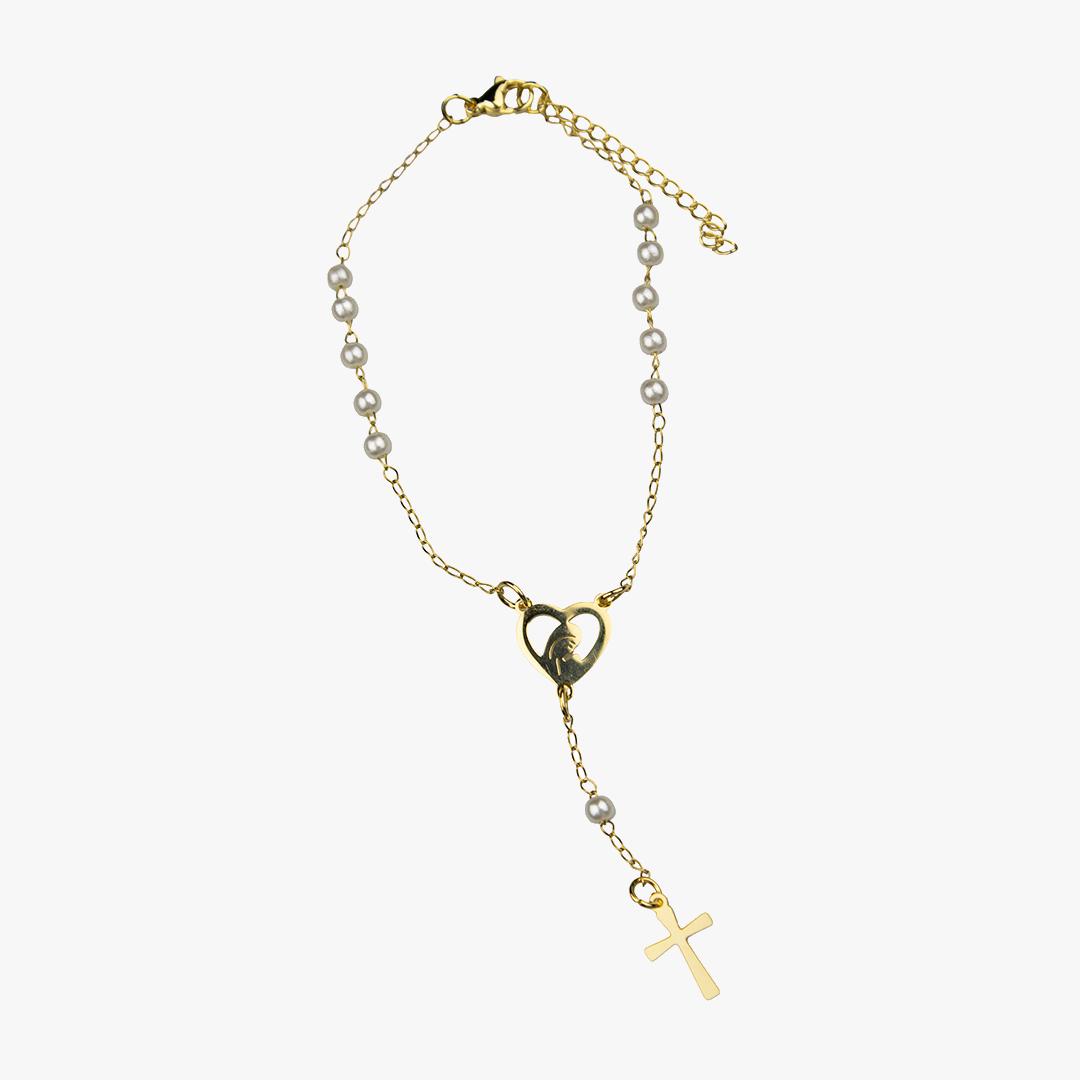 Dezena em pérola e aço dourado, com mosquetão.