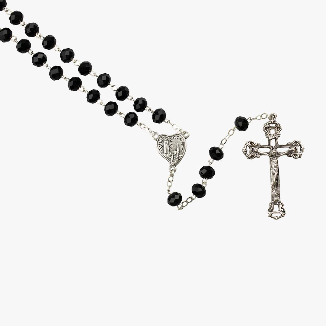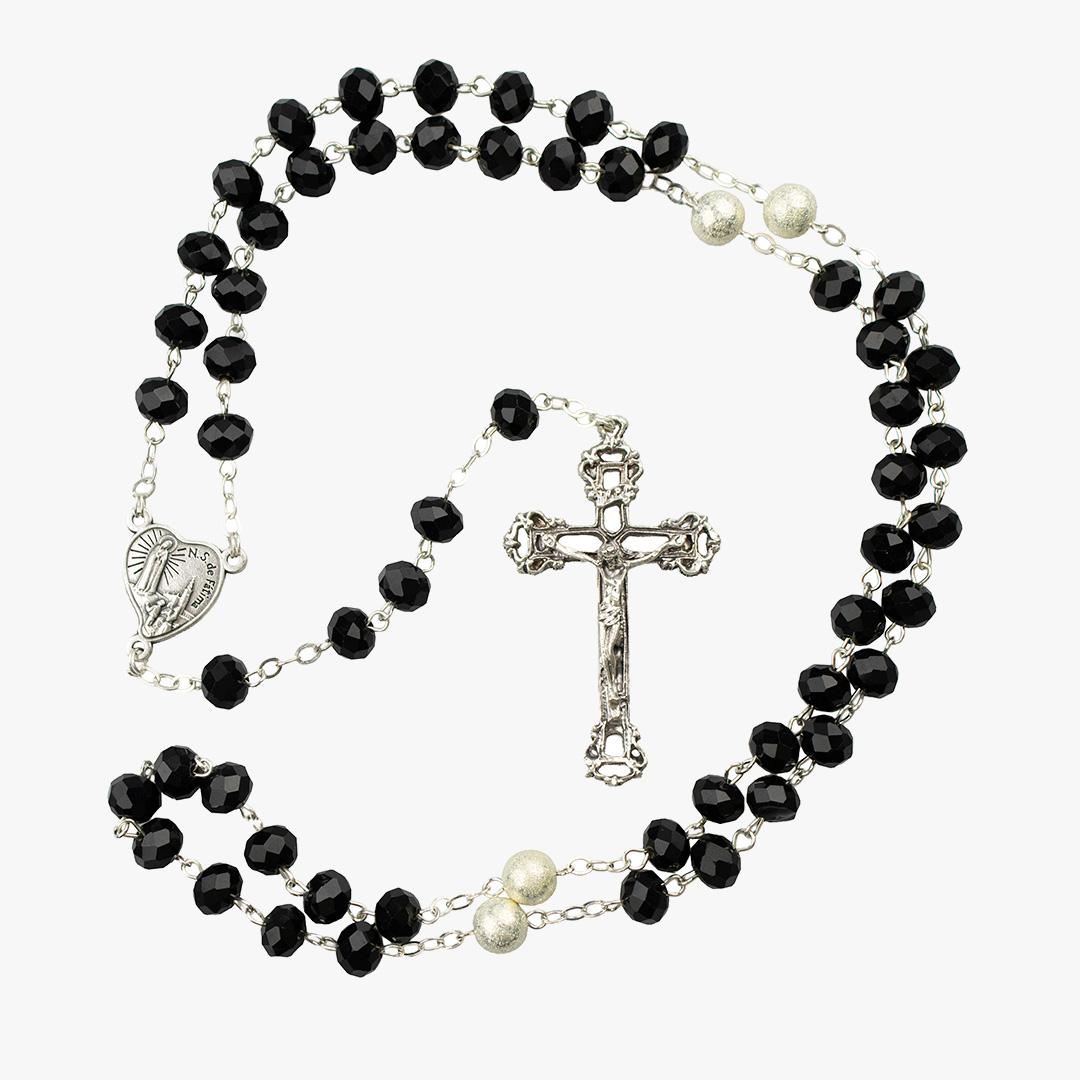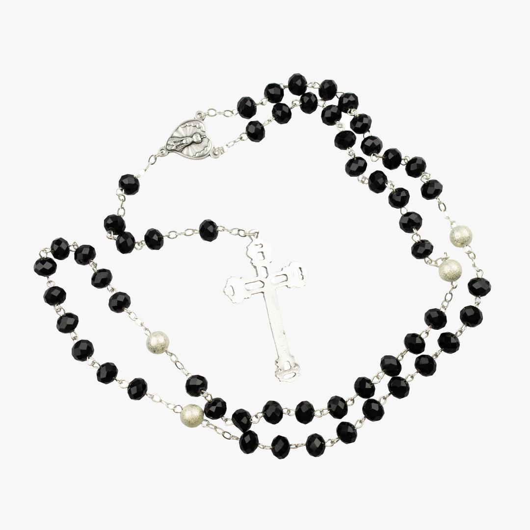 Terço com as contas em cristal preto e as contas que dividem os mistérios, redondas e prateadas.