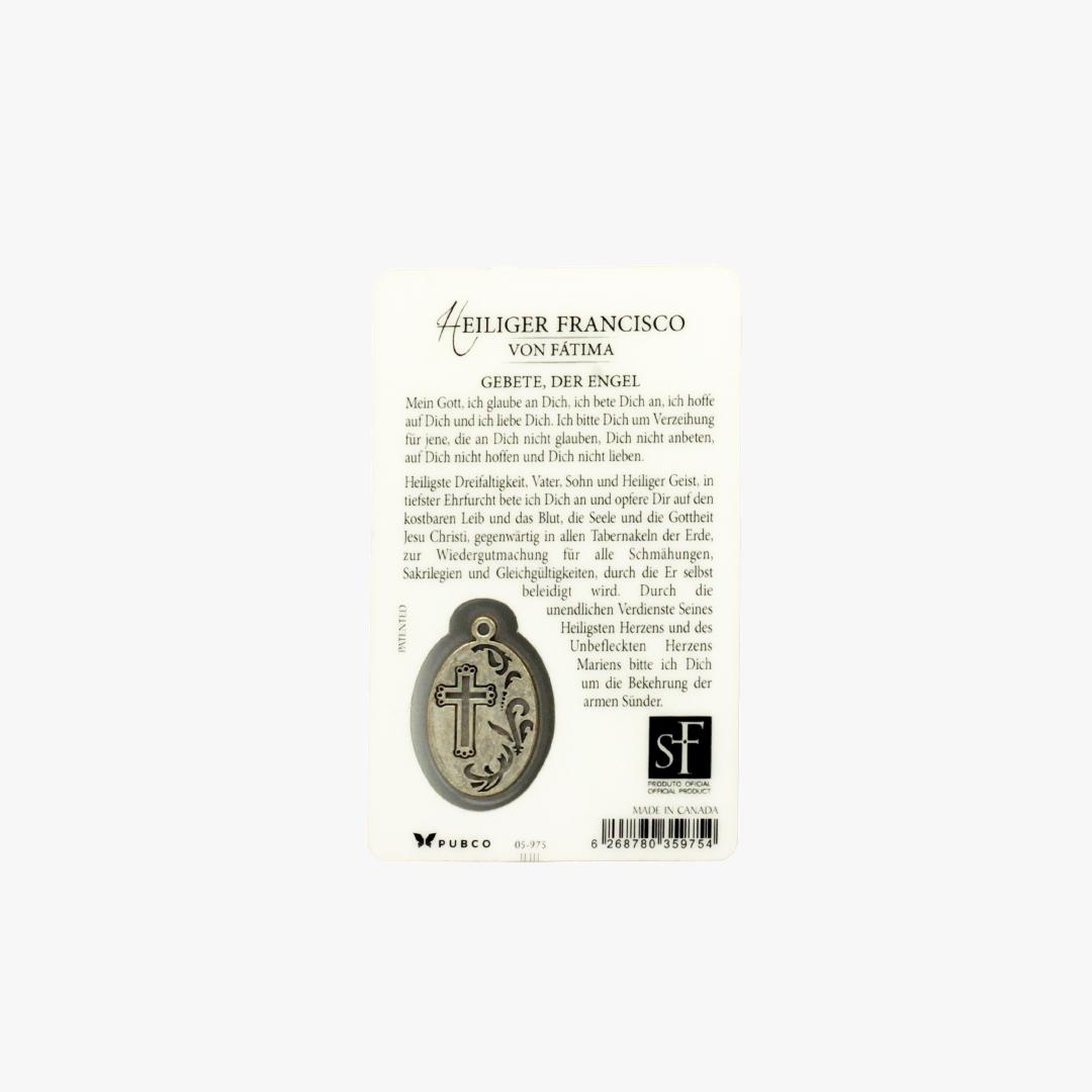 Pagela com a imagem de São Francisco Marto e medalha com a Aparição de N. S. de Fátima. No verso a oração do Anjo.