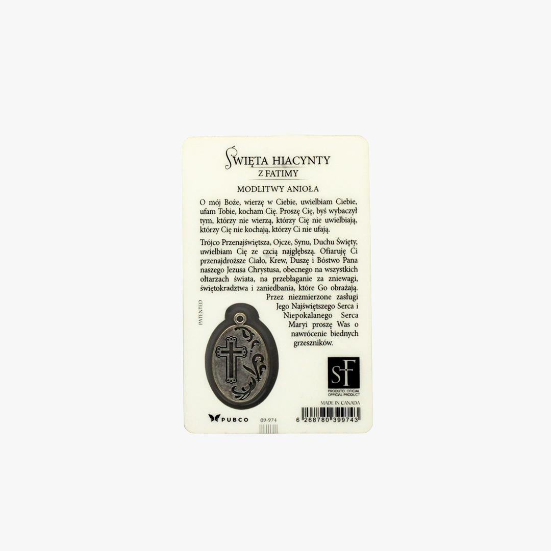 Pagela com a imagem de Santa Jacinta Marto e medalha com a Aparição de N. S. de Fátima. No verso a oração do Anjo.