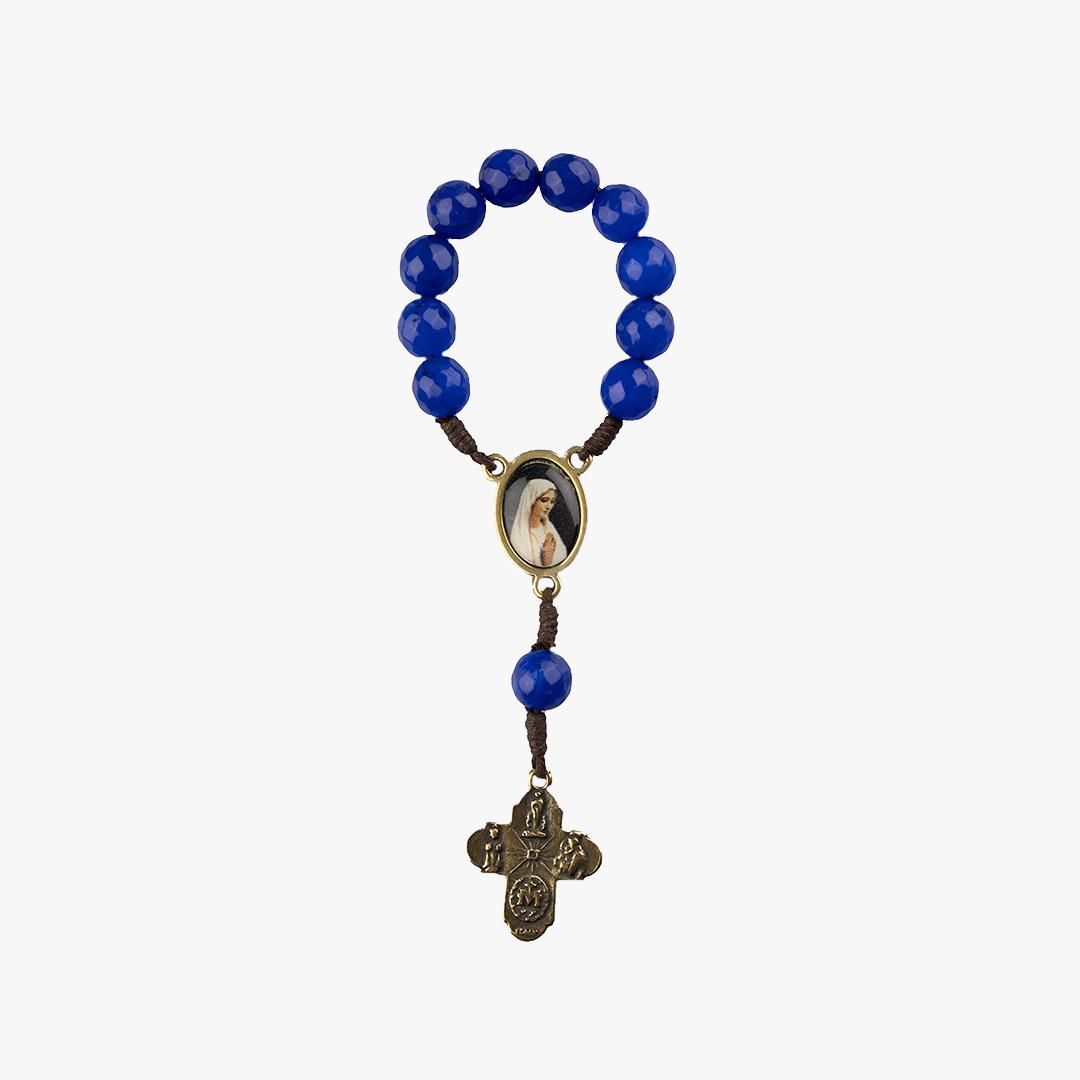 Dezena em pedra Agata azul escuro. Medalha com a Aparição de N. S. de Fátima numa das faces e na outra face N. S. de Fátima.