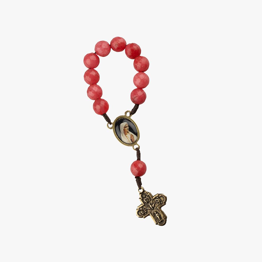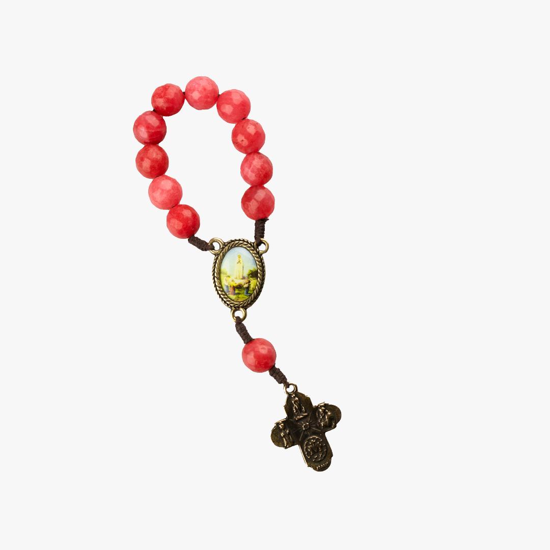 Dezena em pedra Agata cor-de-rosa. Medalha com a Aparição de N. S. de Fátima numa das faces e na outra face N. S. de Fátima.