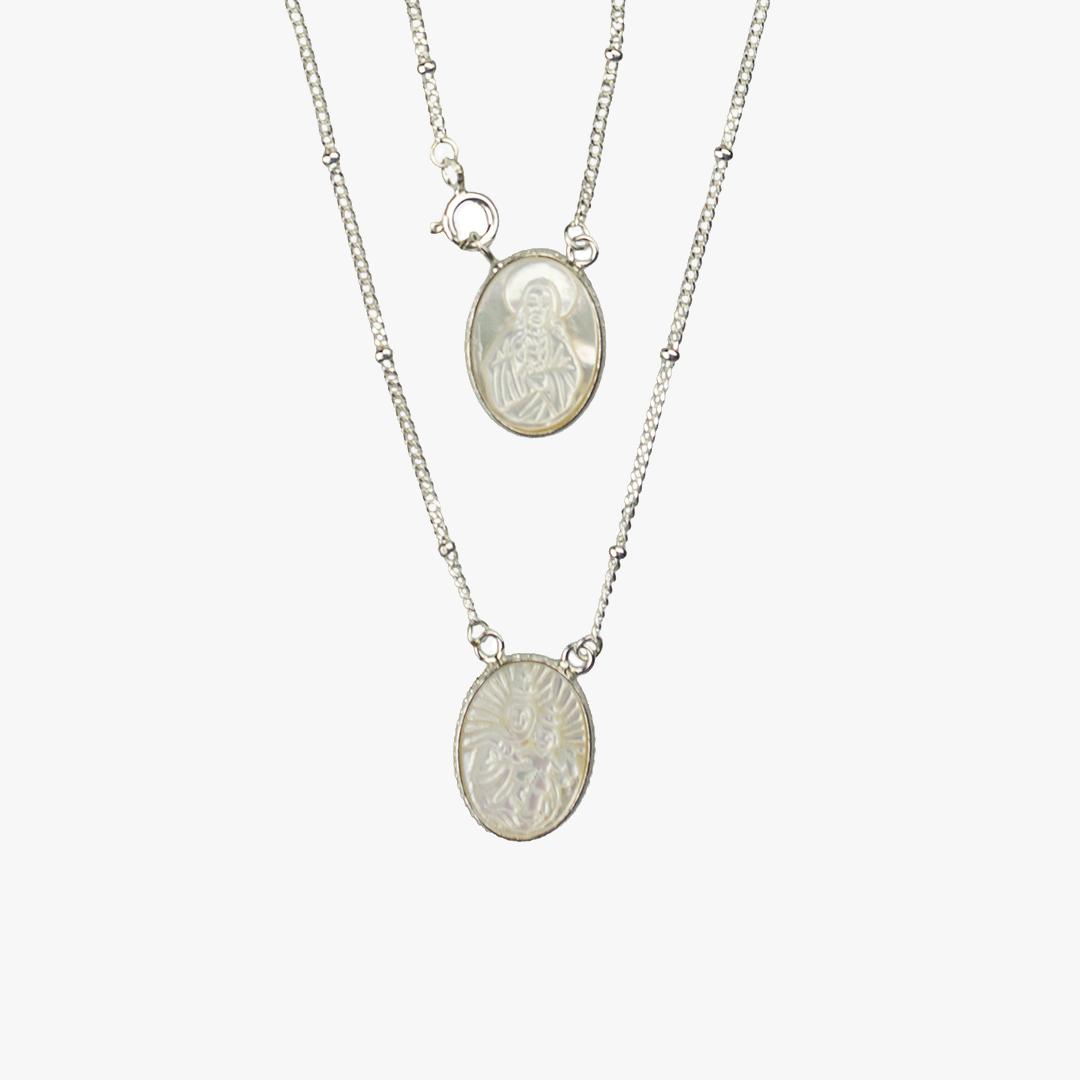 Escapulário de Nossa Senhora do Carmo e Sagrado Coração de Jesus, em prata e madrepérola, medalha oval.
