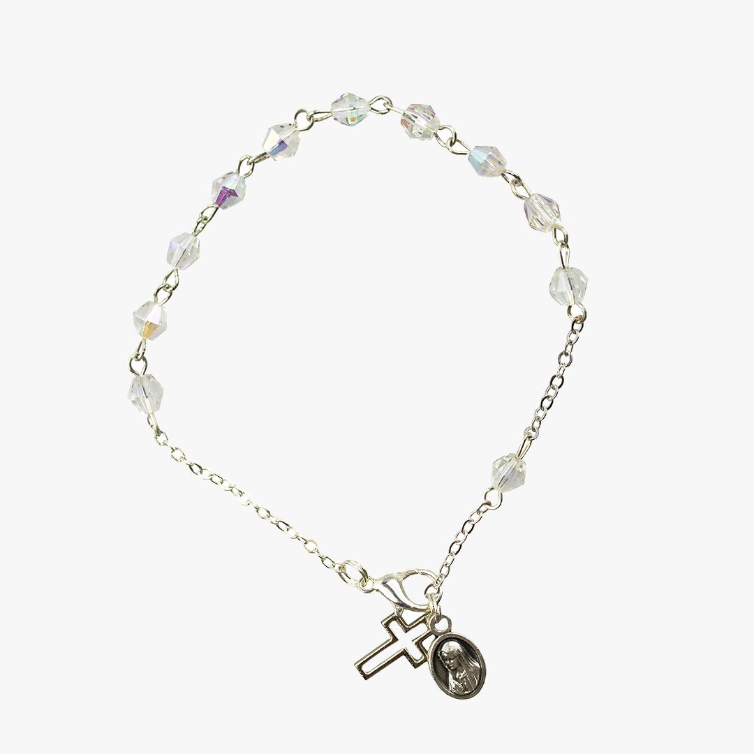 Pulseira com cristais transparentes. Finalizada com pequena medalha de N. S. de Fátima e pequena cruz. Com mosquetão.