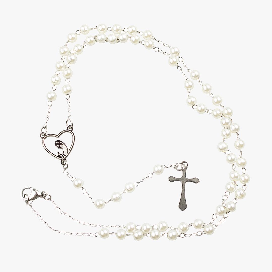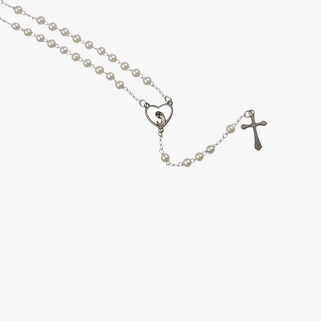 Terço em aço com passador em forma de coração representando N. S. de perfil.