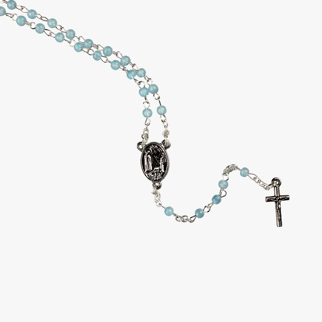 Terço com contas pequenas em vidro e com mosquetão. A medalha que une as partes tem a Aparição de Nossa Senhora de Fátima aos pastorinhos.